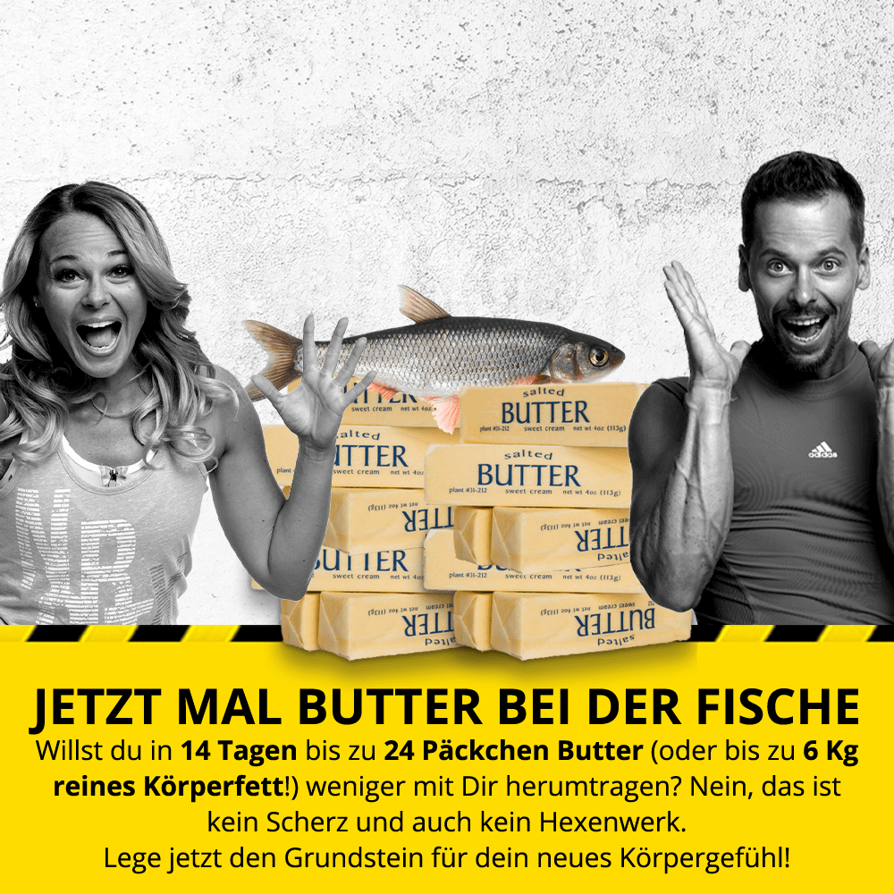Jetzt mal Butter bei die Fische… Willst Du in nur 14 Tagen bis zu 24 Päckchen Butter (Oder bis zu 6 Kg reines Körperfett!!!) weniger mit Dir herumtragen?